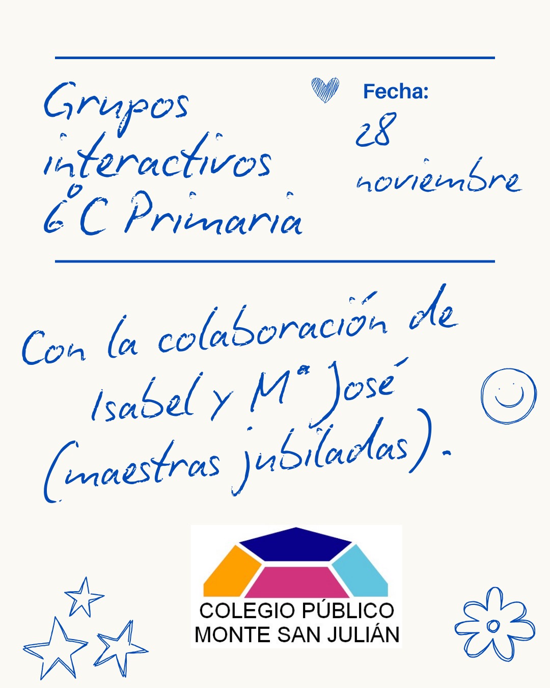 Seguimos con los grupos interactivos. Esta vez en el curso de 6°C de primaria. Contaremos con la colaboración de dos antiguas compañeras. ¡Mil gracias por colaborar con nosotros!![]()